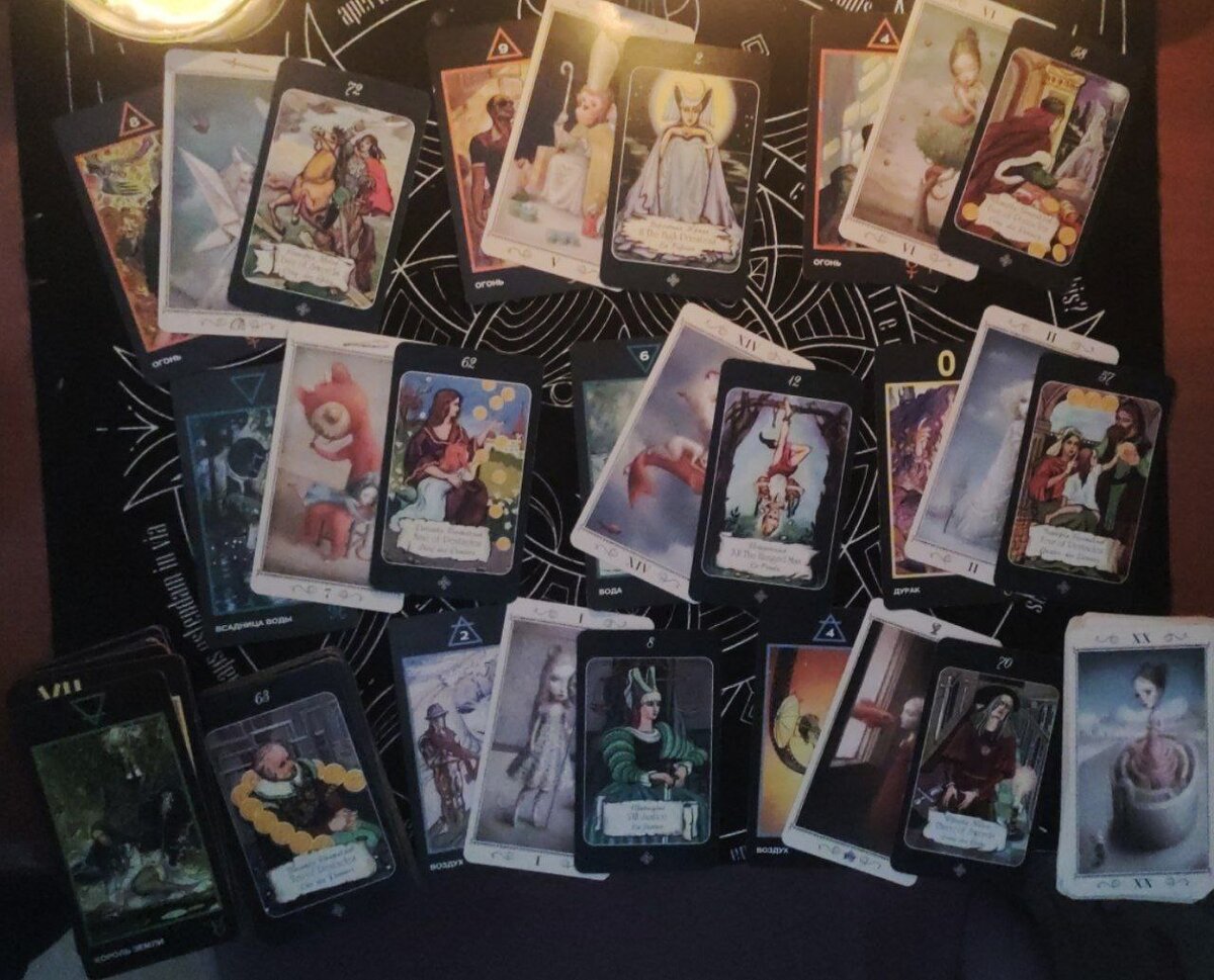 Дно колоды — Король земли, Высший Суд, 10 пентаклей. Фоном данного расклада выходят карты, которые показывают, что ваш партнер сейчас находится в состоянии потери и боязни своих собственных настоящих чувств к вам. Он запутался и находится в тупике, так как не знает, что делать дальше в этой ситуации, как разрешить данную конфликтную ситуацию между вами. Мужчина понимает, что совершил ошибку, но ему трудно взять на себя ответственность за принятие решения или свои поступки, поэтому вашему партнеру хотелось бы, чтобы вы сами исправили бы его ошибку, пришли бы к нему сами и всё бы наладили и «разрулили». Но этого не происходит, вы не приходите, поэтому этот человек находится в своем одиночестве, а если рядом с ним есть другая женщина, то это - «одиночество вдвоем». Ведь на карте 10 пентаклей мужчина изображен один, в одиночестве. У него все есть в материальном плане, он обеспечен, но одинок.