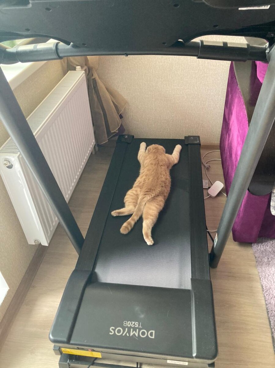 Сегодняшним утром Степан решил заняться спортом. Плотненько покушав и тщательно поковырявшись в лотке, он гордо задрав хвост, выдвинулся в сторону спортивного инвентаря. Настойчиво мяукая попросил меня запустит чудо машину.... и спустя две минуты вот что получилось.... .... спорт это не наше.... нам бы поспать...)