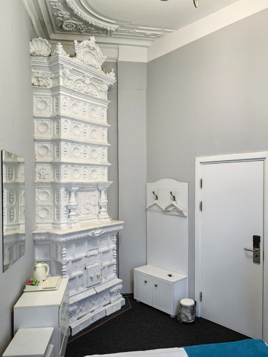 Помимо печи в номере в хостеле есть ещё одна, иного вида. Находится в общей зоне - в коридоре. Когда-то она тоже была частью парадного зала. Её корона сейчас скрыта подвесным потолком.