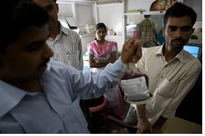 Легальное донорство крови в Индии работает несколько иначе, чем в других странах мира. поскольку немногие индийцы готовы сдавать кровь из чистого альтруизма, ожидается, что пациенты предоставят своих собственных доноров для сдачи крови в банк крови, чтобы заменить пинты, которые они будут использовать во время операции. после того, как пациент получил кредит на донорство крови через друга, он может получить соответствующую единицу для своей собственной операции. Теоретически это означает, что друзья и семья должны сделать шаг вперед, чтобы прийти пациенту на помощь. Но реальность системы иная. Вместо того, чтобы просить своих родственников сдать кровь, большинство людей полагаются на неформальную сеть профессиональных доноров, которые тусуются перед больницами, готовые сдать кровь в обмен на небольшую плату.