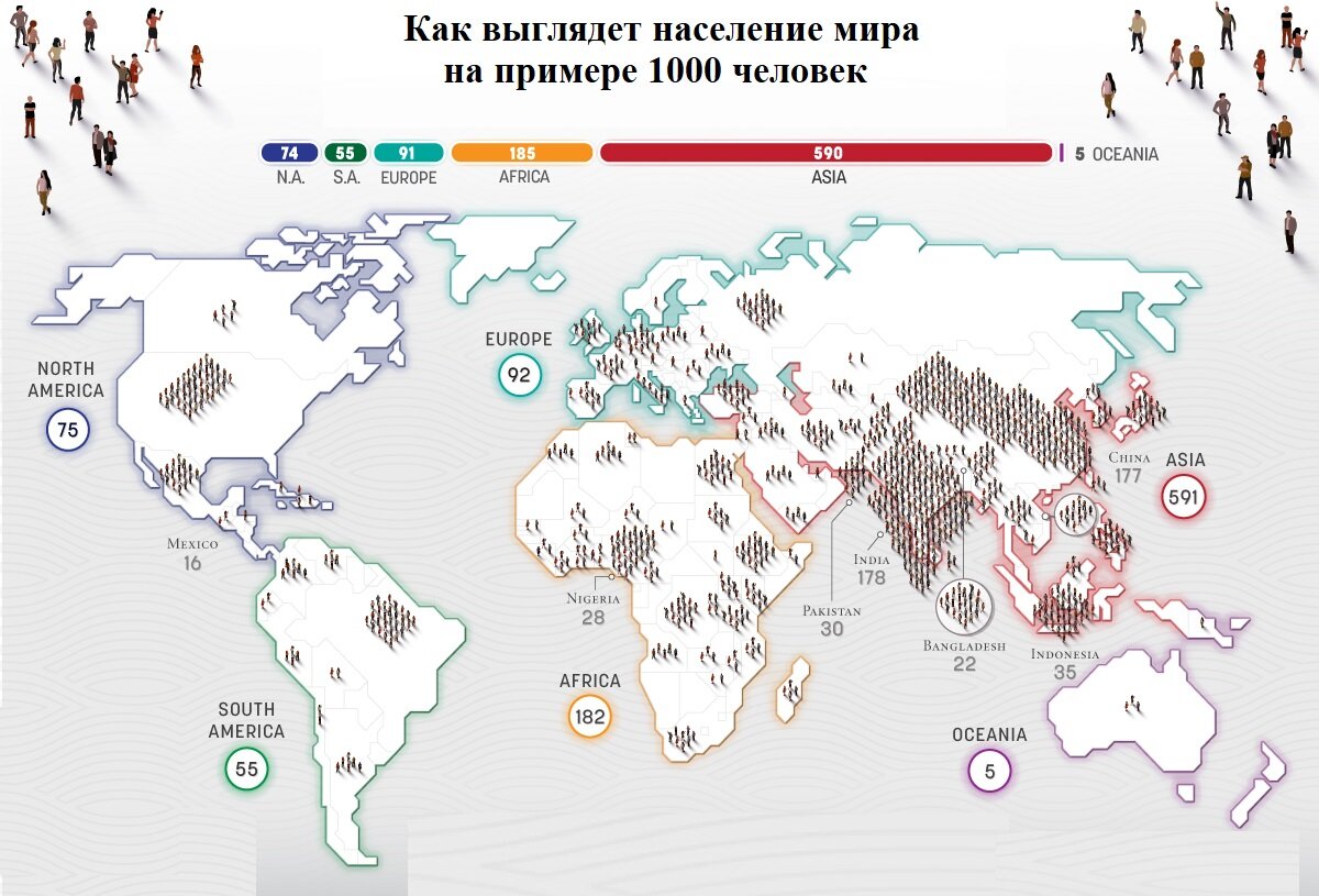 Сегодня в мире проживает более 8 миллиардов человек, и эта цифра стремительно растет. Только за последние пятьдесят лет, население нашей планеты увеличилось ровно в 2 раза. Больше половины людей на планете живут в Азии. На карте выше можно увидеть, каким образом это количество людей было бы распределено по всему земному шару, если бы вместо 8 миллиардов, людей на планете было бы всего 1000 человек. Так легче проиллюстрировать количество людей проживающих на Земле. Таким образом, в Индии будет проживать 178 человек, а в Китае 177. На верхней карет не представлены только страны, население которых менее 7 тысяч человек. В Азии проживает почти 5 миллиардов человек, большая часть из которых сосредоточена в Индии и Китае. Вот еще один хороший пример – население Исландии почти 400 тысяч человек, так вот в масштабах планеты, доля исландцев во много миллиардном мире будет составлять 0,0% т.е. ничего. Если представить, что всех этих 8 миллиардов жителей Земли как одну тысячу человек, то в Индии
