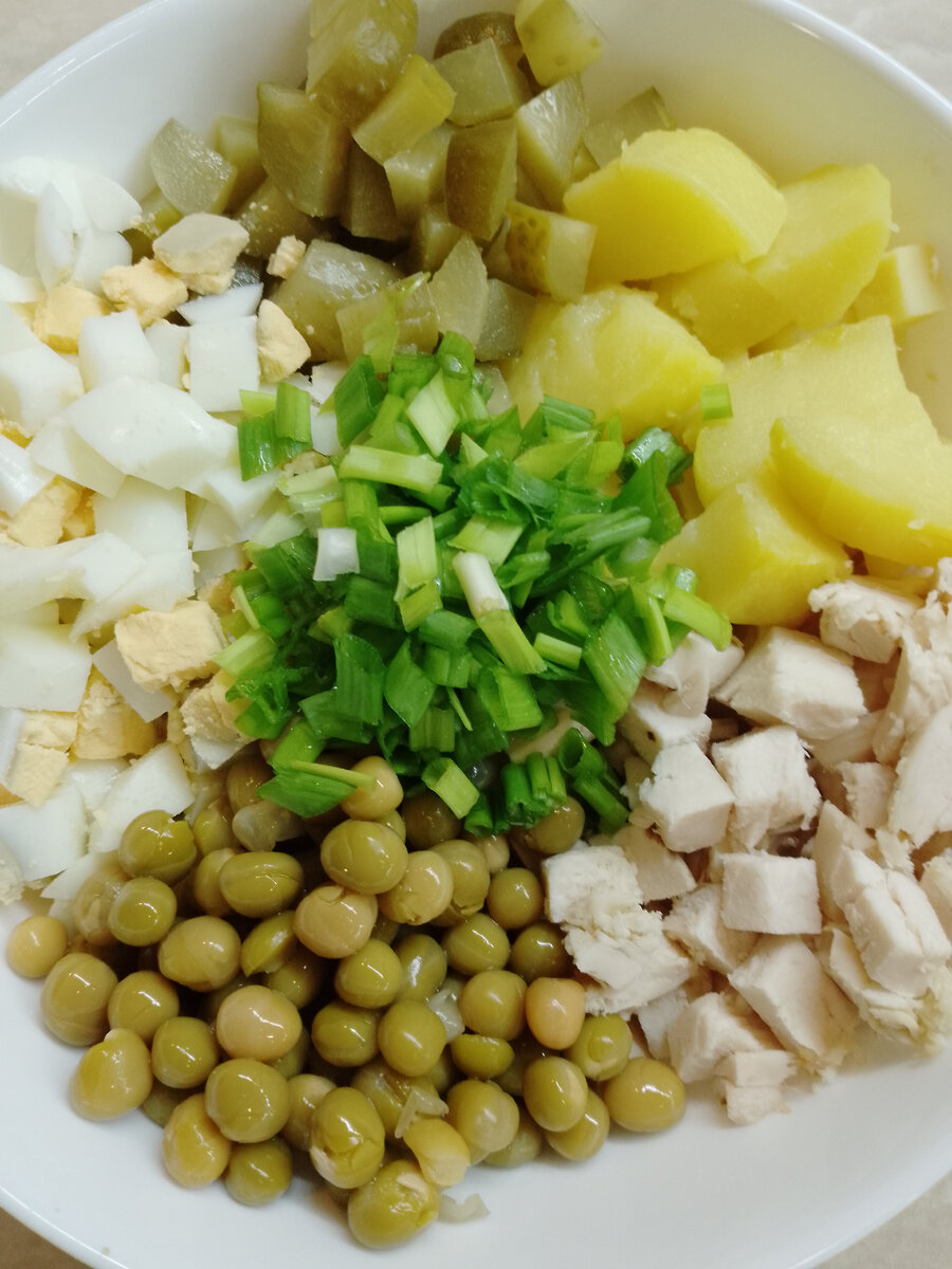 Прекрасная альтернатива, всеми нами любимому, оливье. 😁👍 Картошку, куриные яйца, маринованные огурцы ( можно взять свежие или добавить оба вида огурцов) , куриную грудку режем кубиком. Добавляеи консервированный горошек и зеленый лук. Заправляем майонезом. Соль, перец по вкусу. Уместно добавить свежую зелень укропа и петрушки. Просто, вкусно... Уместно подать как для обеда в кругу семьи, так и на правзничныц стол. Приятного аппетита!