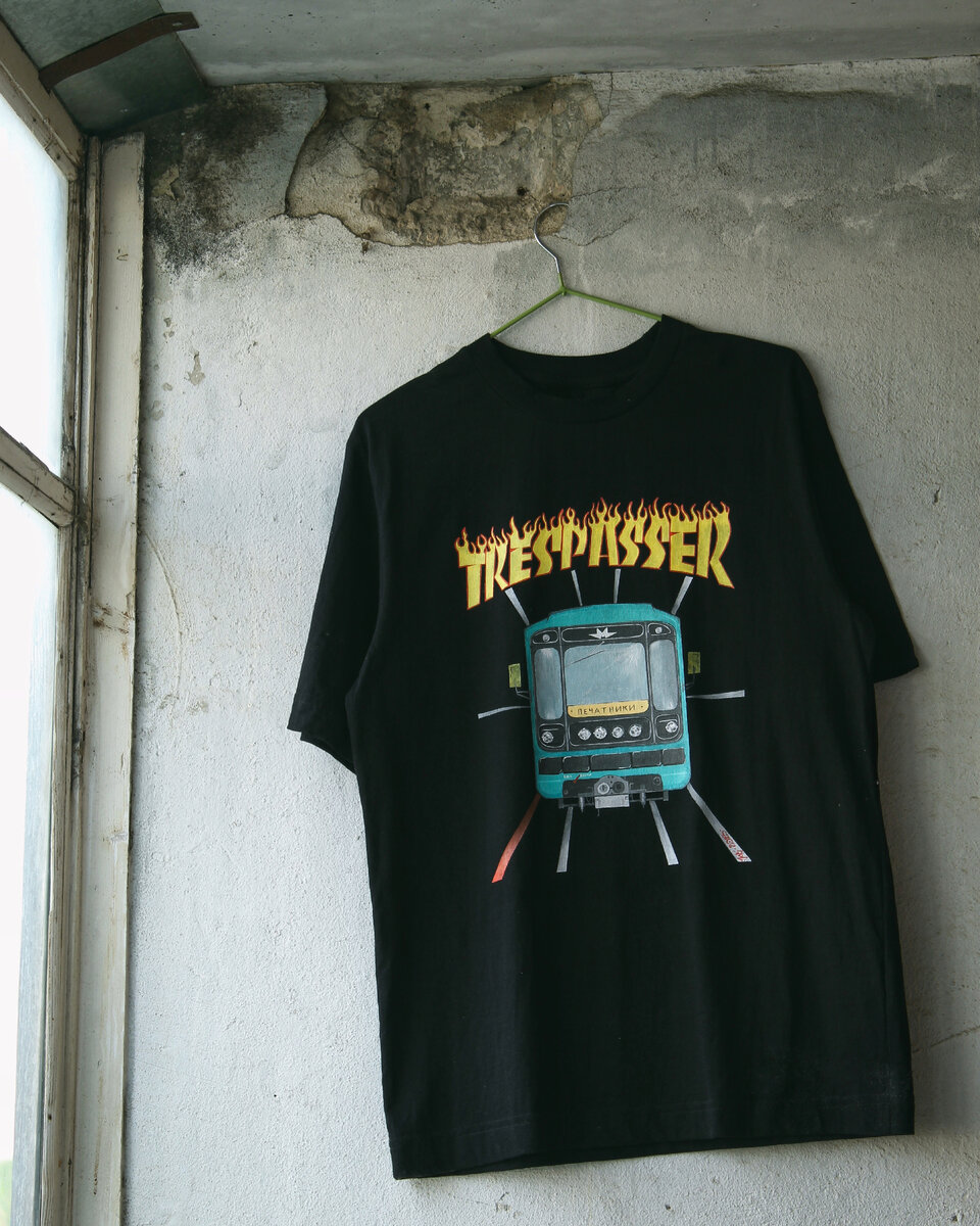 Случилась у меня как-то классика московского метрополитена. Да, именно случилась. Заказали поезд нарисовать, а я говорю: номерной давай, классика же". Вообще именно эти поезда настолько известны, что стали частью культуры уже давно: не только в метро мы их встречаем, но и в художественной фотографии, на картинах. Шрифт, кстати, как и слово, которое переводится "нарушитель границ" выбирал сам заказчик. Я бы как всегда впихнула сюда коронное каллиграфическое неразборчивое месиво, но не дали. В целом, мне всё равно нравится. За основу взята вот эта фотография из интернетов. Эскиза не было, рисунок упрощался прямо в процессе. Между делом: чтоб лучше рассмотреть тёмные детали в таком случае, можно в фоторедакторе выкрутить яркость. Когда я делала эту майку, и меня даже мысли не было о создании канала на дзене, поэтому процесс не совсем подробный ⬇️ Скотч - это границы изображения, чтоб не сместиться куда-нибудь не туда. Разметка в данном случае была белой термоисчезающей ручкой по ткан