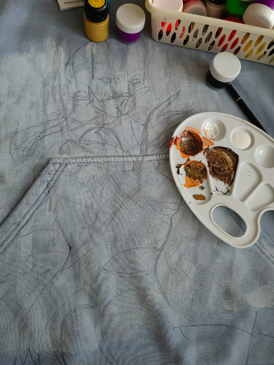 Все мы мамочки любим комфорт, вот и я решила купить себе костюм, спортивный и тёплый . Осень сама по себе мрачненькая , хоть и есть солнечные деньки . Но мне таааак не хотелось брать практичный ЧЁРНЫЙ костюм, вот я , кукушка🤪, и решилась взять голубенький ☺. То, что он маркий,а на мне малышняк, который вечно влезает куда угодно где грязно(у каждого свой талант), я, конечно же, не подумала и вуаля, этот костюм попал в мой шкаф). Так как мы переехали в новый город, пару раз нужно было съездить домой и доделать некоторые дела. Ииии....после последней поездки, моему костюму пришёл кердык😭Что я с ним только не делала, ни один пятновыводитель не помог. К сожалению, фото до нет. И я вспомнила как много расписала ранее вещей. Я съездила в магазин рукоделия , закупила широкую кисть, грунт, краски по ткани. Зашла в магазин печати и распечатала понравившейся арт с интернета. Прикупила копировальную бумагу. И побежала домой реанимировать костюм . Нанесла грунт, дала высохнуть и с помощь