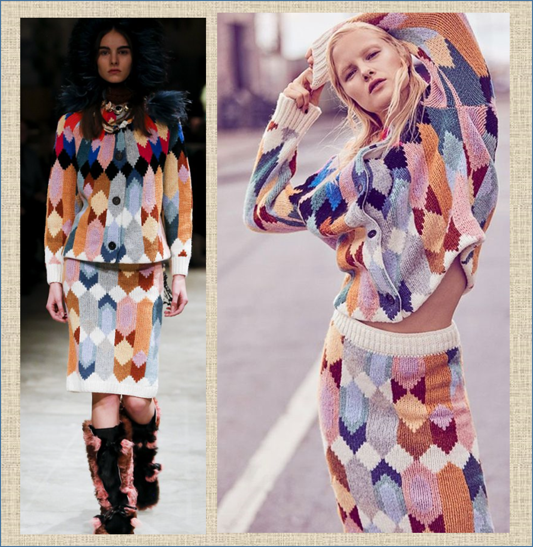Prada осень-зима 2017-2018 выдала вообще много-много всего шикарного, особенно мне понравился трикотажный костюм из шестиугольников и ромбов. Очень изящно и лаконично, недаром же вязальщицы прямо таки метнулись наперебой его вязать. Но ведь красиво. Вроде бы много цветов, а выглядит не кричаще и не ярко. Все в меру и все очень гармонично.++ Рисовать схемы не стала, а поискала на фото где сделаны прибавки и поставила в этих местах красные точки, вот что вышло: А вы не вязали такое? Делитесь опытом! Конечно приглашаю и в мои группы в ВК, вот и ссылки на них: - ВК - МНЕ ИНТЕРЕСНО и - МНЕ ВКУСНО - сборник подходящих рецептов И я еще раз приглашаю вас в свой новый телеграмм-канал, очень старательно собираю там свой материал по жаккарду. Уже очень много опубликовала и еще обещаю много-много всего самого интересного. Заходите. Всем очень рада, вот ссылочка: МНЕ ИНТЕРЕСНО и мой жаккард- ЛУЧШЕЕ (вязание, схемы, описания) Всем творчества! ❄❄❄❄❄❄❄❄❄❄❄❄❄❄❄ Буду очень рада вашим комментариям и об