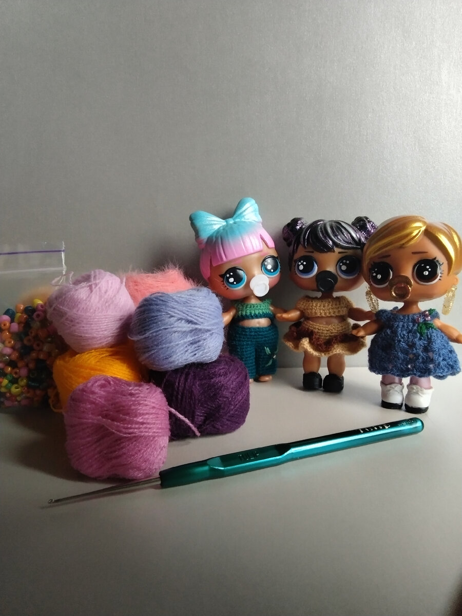 Марафон 50/50. 50 нарядов для малышек Лол за 50 дней . У меня возникла идея создать марафон, я обожаю проходить марафоны и обожаю вязать куклам. Вот это соединилось и родилась идея создать такой марафон. Не так давно в мою кукольную семью попали малышки Лол, это любовь...Связала им несколько нарядов, и попалась... Теперь не могу выпустить их из рук. Для марафона нам понадобятся тонкие ниточки, я взяла акрил для вышивания, крючок, бусинки, кнопочки, бантики для украшения... Я планирую каждый день вязать один наряд и выставлять фото и описание. Для меня это вызов! И тем интересней! Приглашаю вас в этот увлекательный процесс! Вяжите своим куколкам и на продажу.