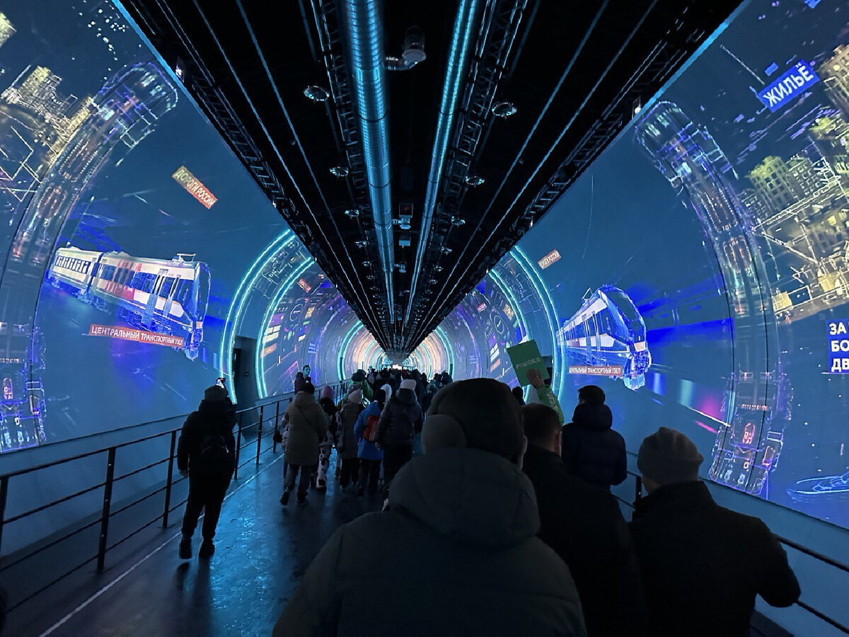 В честь достижений построен огромный тоннель. Думали мы, что там выставлены какие-то стойки, где стоит представитель региона и с ним можно пообщаться. Но это просто труба обшитая дисплеями, где зрителям доводится информация.