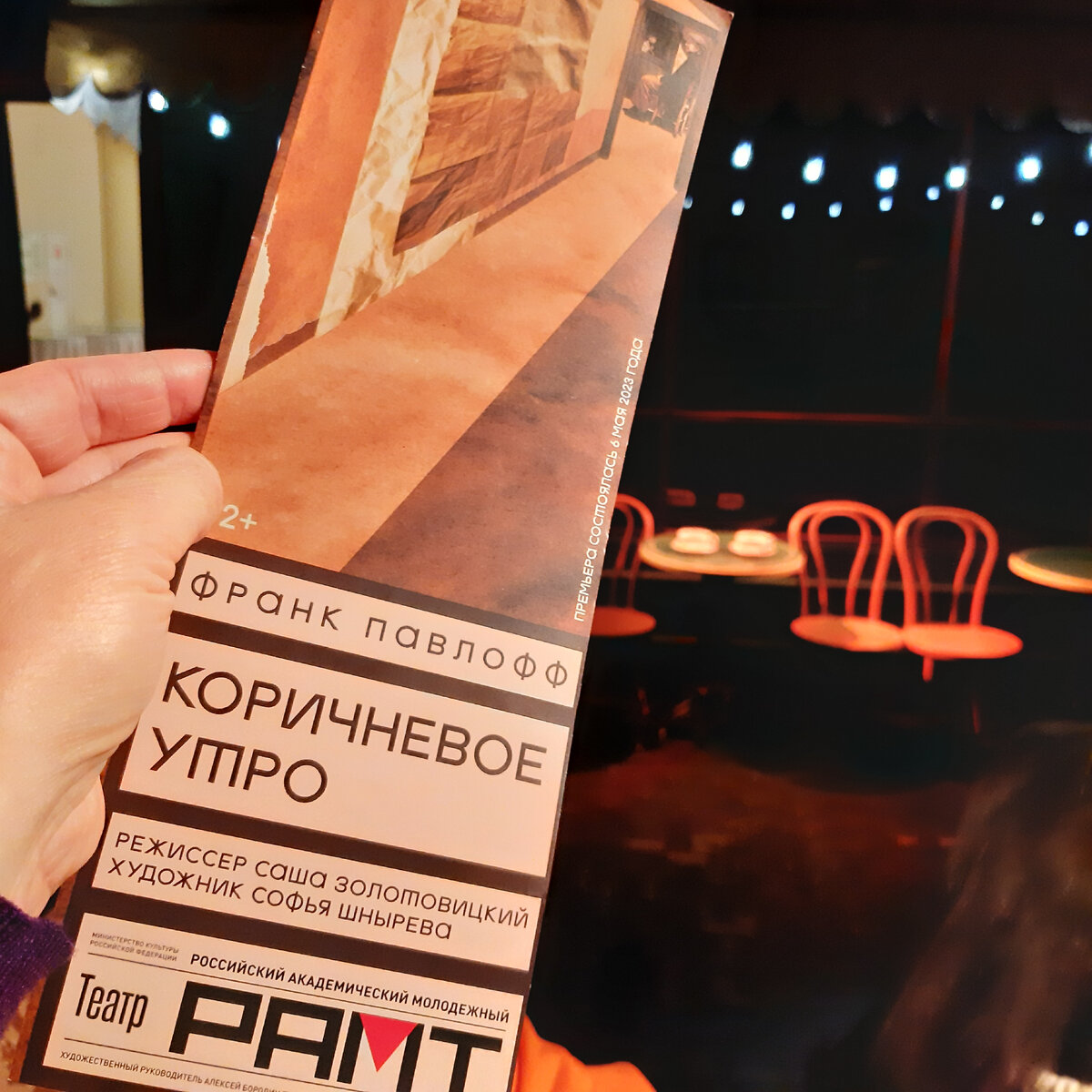 Похоже, с детскими спектаклями покончено совсем( ну если только я сама захочу глянуть детское что-то ибо "там одни малыши")), поэтому с Кирой мы теперь по спектаклям для подростков. "Коричневое утро" от Российского академического Молодежного театра - РАМТ - один из таких спектаклей. "Коричневое утро" - майская премьера этого года. Основой спектакля послужила новелла, написанная Франком Павлоффом в 1998 году. С новеллой мы были не знакомы, поэтому наше восприятие спектакля было исключительно на основе того, что мы видели на сцене. А билеты покупались "по совету друзей" и на тот спектакль, который надо посмотреть перед легендарной "Волной". Прекрасное утро! Два приятеля встречаются в кафе, пьют ароматный черный кофе и болтают о разном. А вокруг формируется государство Коричневых и, на первый взгляд, кажется, что соблюдай правила и будешь жить спокойно. Но принятые декреты делают все коричневым вокруг: кошек, собак, газеты, одежду и даже чашки для кофе стали коричневыми. Кажется, что в