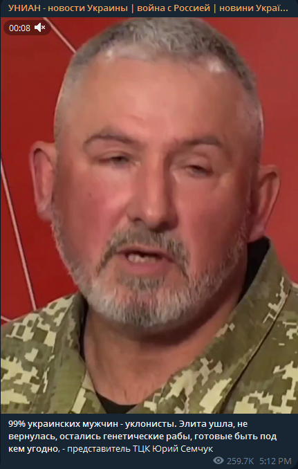 Это он так хитро пытался скрыть тот факт, что 99% мужчин Украины - русские, что они понимают, что Россия не несет угрозы населению Украины, и что на 1% сумасшедших нацистов, которые ушли добровольцами на фронт, и не из любви к Родине, а из жажды крови, из желания "резать русню", приходится 99% нормальных людей, не желающих умирать за капиталы Порошенко, Коломойского, Тимошенко и Ахметова и воевать со своими