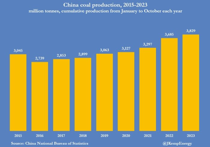 Доля тепловой генерации (газ+уголь) остается превалирующей в общей электрогенерации. Пик угольной генерации вряд ли наступит ранее второй половины десятилетия. Китай ожидает рекордного потребления электроэнергии и газа зимой 2023/24 года, но поставки должны быть адекватными, с лишь локальными дефицитами в результате значительного накопления топлива в летние месяцы. Пиковый спрос на электроэнергию может увеличиться на целых 140 миллионов киловатт (12%) по сравнению с зимой 2022/23 года, прогнозирует Национальное энергетическое управление (NEA). Потребление электроэнергии резко возросло после того, как страна сняла ограничения, связанные с противодействием распространения эпидемии коронавируса. Но ожидается, что выработки будет достаточно, за исключением некоторых местных дефицитов, в основном в провинции Юньнань на юго-западе и в некоторых частях Внутренней Монголии на северо-западе. Правительство способствовало значительному увеличению внутреннего производства и импорта, чтобы максимиз