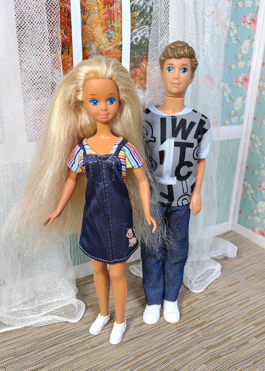 Мы, стандартно, шагаем парами)) Никак мне не подбиралась Скиппер. Я все хотела найти из своей серии Hawaiian Fun, но всякий раз мне не везло с шеями - у всех трещины. А новую в коробке видела только раз и за заметные деньги. Тем не менее, Скиппер приобрести себе хотела, но желательно за скромную сумму. Параллельно у меня лежал в избранном вот этот Кевин. Давно лежал, чуть ли не год. У него в глазах нарисована буква Z, как и у всей серии Hawaiian Fun. Им я хотела дополнить мою пляжную комбинацию, но вот со Скиппер все никак не складывалось. Как вдруг, у того же продавца, у которого я присмотрела Кевина, мелькнула вот эта Скиппер (Wet 'n Wild Skipper, 1989). Не поверите, с абсолютно целым телом, без трещин на шее, только челка острижена и всего за 590р! Я, конечно же, схватила немедленно! И ее и Кевина (Cool Teen Kevin, 1990). По легенде они вроде как встречаются. Но на деле могут быть и братом с сестрой. Так что связи мы пока не установили. Челка как-то удивительно культурна острижена,