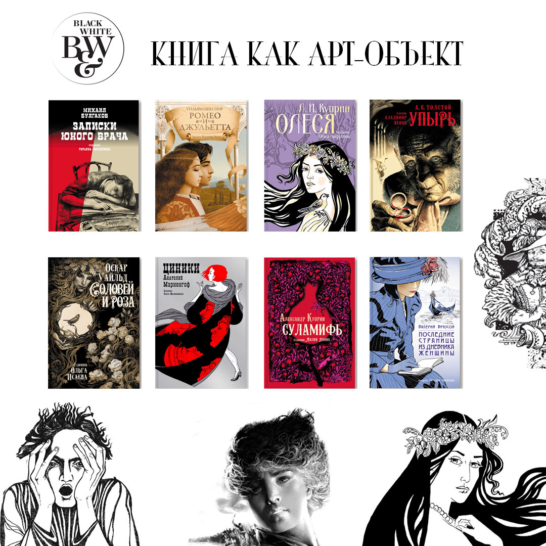 Серия «Black&White» — совершенно особенная, наша любимая, мне кажется, нам удалось создать уникальную концепцию иллюстрированной книги для взрослых под девизом «Книга как арт-объект». А началось все с того, что мы рассматривали чудесно иллюстрированные детские книги, и нам стало грустно: почему всем кажется, что взрослые не любят картинки? Вот мы и решили побаловать наших взрослых читателей густо иллюстрированными изданиями их любимых произведений. Конечно, иллюстрированные книги представлены на рынке и сейчас, но в основном их ценник весьма высок. Мы же предлагаем «народный», «бюджетный» вариант; а для этого выбираем художественные произведения небольшого объема — ведь иллюстрации предполагаются почти на каждом развороте! Мы охотно сотрудничаем как с маститыми художниками, так и с молодежью. Еще одно принципиальное решение: после одобрения пробных иллюстраций и утверждения стиля мы разрешаем художникам давать фантазии полный простор и творить в свое удовольствие. Результаты радуют: