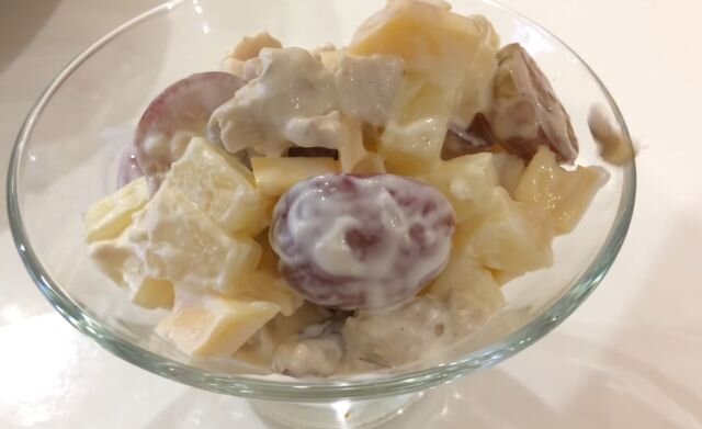 Для приготовления салата по этому рецепту сыр нужно будет нарезать кусочками, и для того, чтобы блюдо было более сочным дополнительно добавим виноград. Обратите внимание, что в качестве заправки здесь используется йогурт, так как он лучше сочетается с фруктовой составляющей. Но вы, при желании, можете использовать привычный майонез. 🔥 Лучшее в телеграм: Посмотреть Ингредиенты: Способ приготовления: Шаг 1. Отварите куриное филе. В кипящую воду добавьте чайную ложку соли, добавьте 5 горошин душистого перца, положите оду луковицу и морковь. Отваренное филе в таком бульоне будет особенно вкусным. Готовую курицу остудите и приступайте к приготовлению салата. Шаг 2. Сыр, и отварное куриное филе нарежьте кубиком. Виноград разрежьте пополам. Если у вас сорт с косточками,то их необходимо удалить. Просушите на раскаленной сковороде без масла грецкие орехи, затем измельчите их. Слейте из банки с ананасами воду. Шаг 3. Соедините все ингредиенты в салатнике, заправьте йогуртом и перемеша