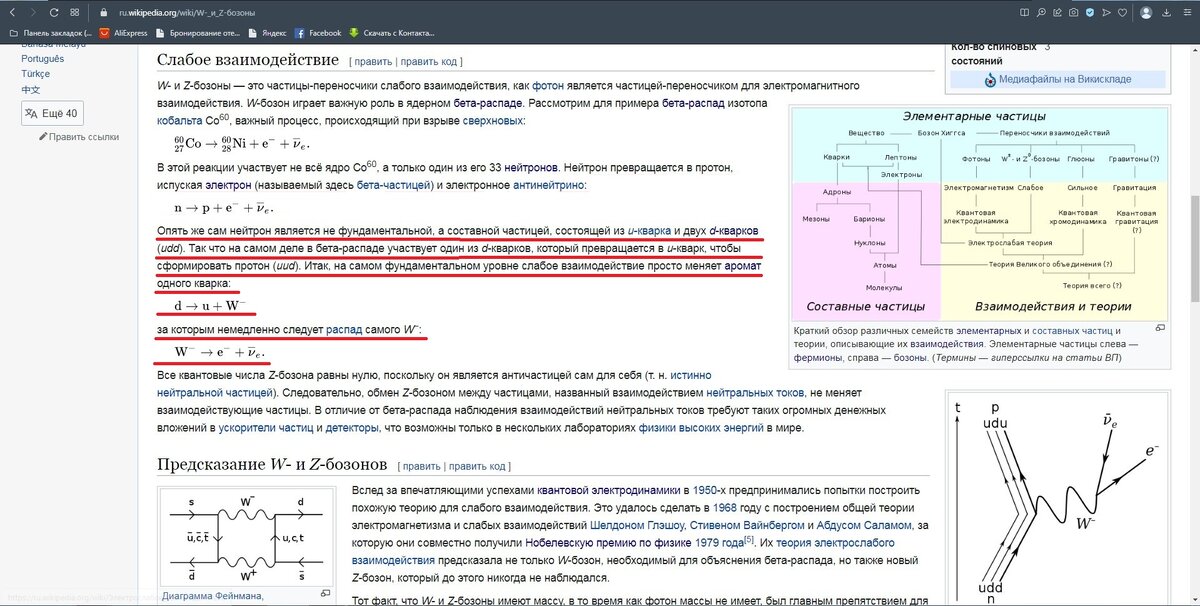 Стоп! Масса нейтрона - 0,939565...ГэВ, а масса W-бозона больше 80ГэВ. Это что - мышь родила слона? Как нейтрон может излучать W-бозон если его масса в разы меньше? Где закон сохранения энергии? Разница по массе не просто большая - она ни в какие ворота не лезет. При чём я взял массу всего нейтрона, в то время как излучает W-бозон только один из трёх кварков, и соответственно разница в массе будет ещё в несколько сот раз больше. Зато сам W-бозон распадается на электрон и электронное антинейтрино - которые в свою очередь во много раз легче его, опять же не стыковка по массе только уже в другую сторону. То есть если из всего этого уравнения убрать W-бозон то всё сойдётся - масса нейтрона будет равна суммарной массе протона, электрона и электронного антинейтрино.