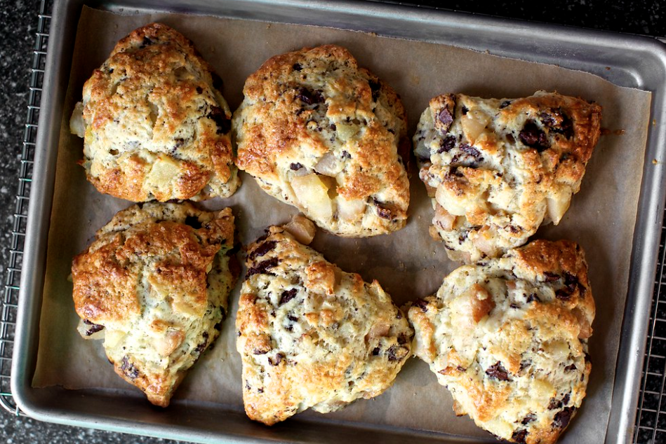 Прекрасный рецепт булочек с грушей и кусочками шоколада. Будут отличным дополнением к завтраку. Попробуйте приготовить, вам понравится! Ингредиенты: Приготовление: 1. Очистите груши от кожуры и сердцевины. Нарежьте небольшими кусочками. Застелите большой противень пергаментной бумагой. Разложите кусочки груш на пергаменте и запеките в духовке разогретой до 190 градусов, пока они не станут сухими на ощупь и не подрумянятся снизу, около 20 минут. Переложите пергаментную бумагу с кусочками груш на решетку или тарелку для охлаждения и остудите до теплого состояния. 2. Взбейте муку, разрыхлитель, 1/4 стакана сахара и соль миксером. Добавьте охлажденные кусочки груши, кусочки сливочного масла, густые сливки и 1 яйцо. С помощью насадки-лопатки замесите тесто на низкой скорости, пока оно не станет однородным. Добавьте кусочки шоколада и перемешивайте еще 5 секунд. 3. На хорошо посыпанном мукой столе раскатайте тесто в круг. Разрежьте на 6 больших ломтиков и переложите на противень на расстоян