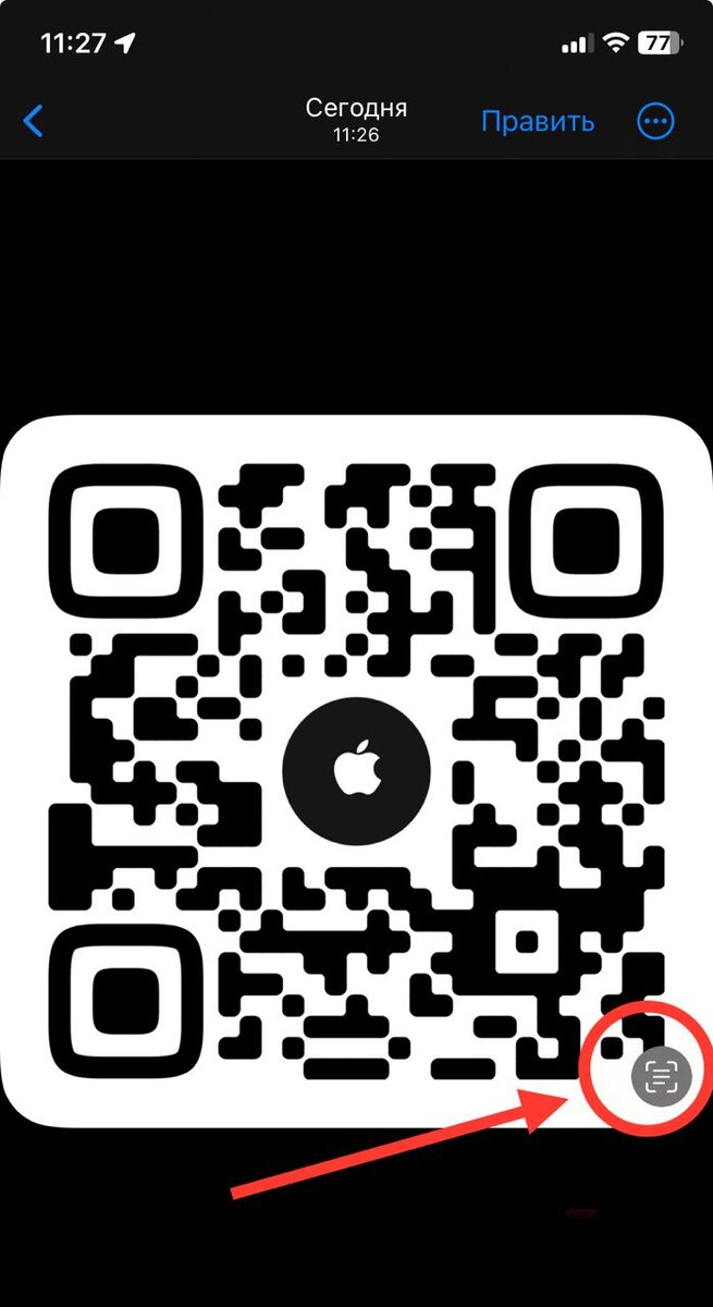 В Telegram все просто, открываем картинку с QR, в правом верхнем углу нажмите на кнопку распознавания текста на картинке, после тапаем на QR и переходим по ссылке. Но в других приложения или браузере подобное не получится, поэтому: 1. Сделайте снимок экрана. 2. Найдите снимок экрана. 3. Нажмите кнопку Распознать текст в правом нижнем углу экрана. 4. Нажмите на QR-код, чтобы открыть дополнительное меню действий. 5. Перейдите по ссылке.