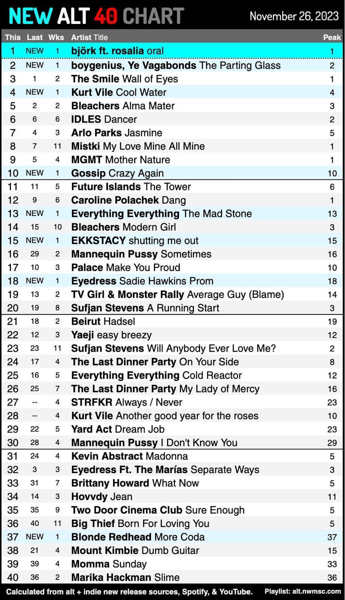 Слушайте лучшие новинки этой недели. Представляем еженедельный хит-парад Инди ТОП-40. 1. BJÖRK & ROSALÍA дебютируют с первого места с синглом "oral". Мы уже написали о нём. BOYGENIUS & YE VAGABONDS, KURT VILE, GOSSIP, EVERYTHING EVERYTHING, EKKSTACY, EYEDRESS также дебютируют в первой половине чарта.