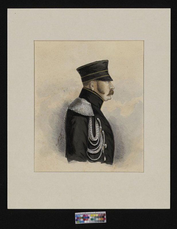 Итак, что мы видим на портрете? Персонаж с усами и бакенбардами облачен в темно-зеленый (фактически черный) офицерский сюртук с воротником основного цвета, имеющим желтую выпушку. На плечах серебряные генеральские эполеты, с плеча свисает серебряный аксельбант. И околыш, и тулья фуражки одного, темно-зеленого (фактически черного) цвета, околыш по верху и низу также украшен желтыми выпушками.