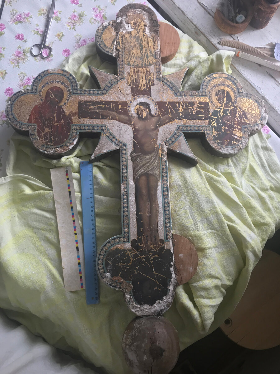 начинаю реставрировать, работы с ним невероятно много. Он был совершенно прекрасен - тонкое грамотное академическое письмо, отличная основа с правильными деревянными сочленениями, умеренная позолота с некричащей изящной орнаментацией . Сейчас состояние его плачевное, но я сделаю всё, Бог даст. Крест связан с именем почитаемого у нас (и много где ещё в стране) схиархимандрита Макария (Болотова), ссылку вклею в комментарий. Для меня это значимое имя, буду спасать то что спас он. Крест двусторонний, очень-очень красивый, даже сейчас. Начальник мастерской проверяет состояние - микрожизни тут, увы, мнооого. Первая задача - стабилизировать состояние базовых материалов креста; и чтоб пожирающая всё микропублика не вылезала - сразу занимаемся геноцидом. Далеков регулярно вспоминаю: хоть я никогда не любила истории Доктора Кто, но далековское "экстерминэйт!" - это про мою работу : ) Готовлю вот рабочий раствор аквамаринового колера. Остатками его пишу каллиграфическое, просто по прив