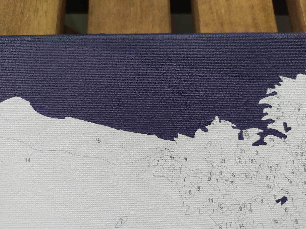Продолжаю рисовать картину по номерам. Стратегия прежняя - рисую одним цветом, начиная сверху. И сегодня это цвет №19 - темно-фиолетовый. И этого цвета тоже две баночки. Но у меня уже опыт вчерашнего дня, так что мне не страшно! 😎 Наверху большая область, но сначала я прохожу границы тоненькой кисточкой, чтобы все было ровно. Только после этого закрашиваю весь участок большой кистью. Есть один момент, пока для меня не очень понятный. Если сначала обвести контур, а потом закрасить внутри, то очертания контура немного выделяются, и не получается однородности. Приходится покрывать еще дополнительным слоем, чтобы хоть как-то выровнять. Но если делать это большой кистью, то есть риск смазать границы. Ладно, разберемся с этим позже. Спускаемся ниже - на очереди множество мелких элементов. Выискиваю среди них номер 19 и беру самую тонюсенькую кисточку. Уже чуть лучше, чем вчера. Очень узкие элементы приноровилась закрашивать, ставя маленькие точки самым кончиком кисти. Вроде получается. Чер