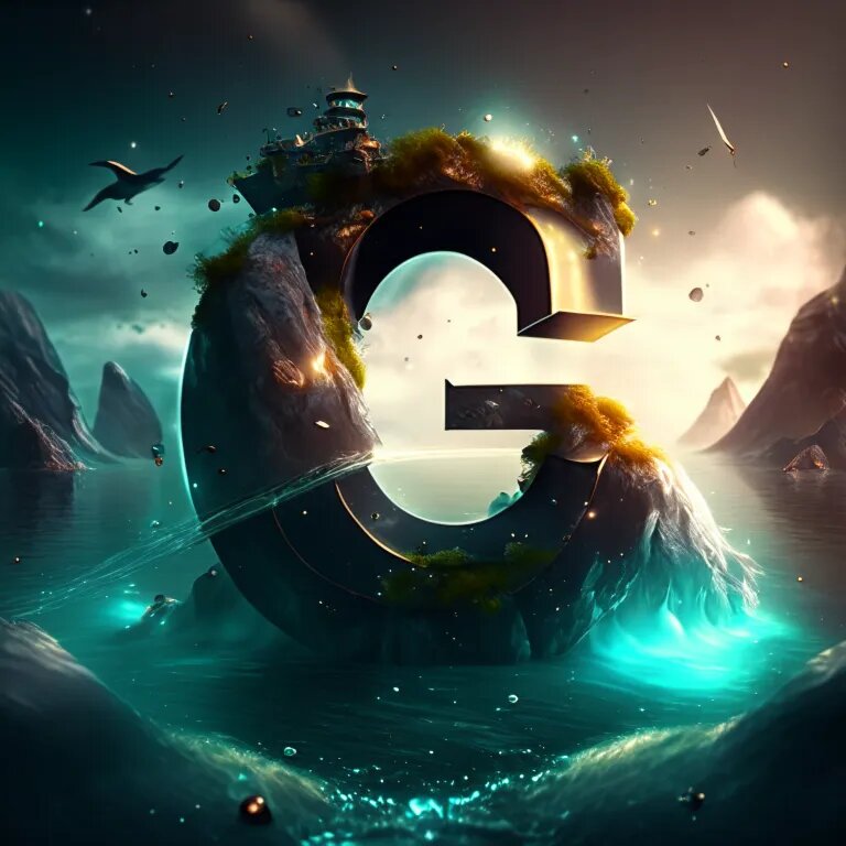 -“perfect letter ‘’G’’ in the middle of the ocean in the style of green island, glowing, birds flying a