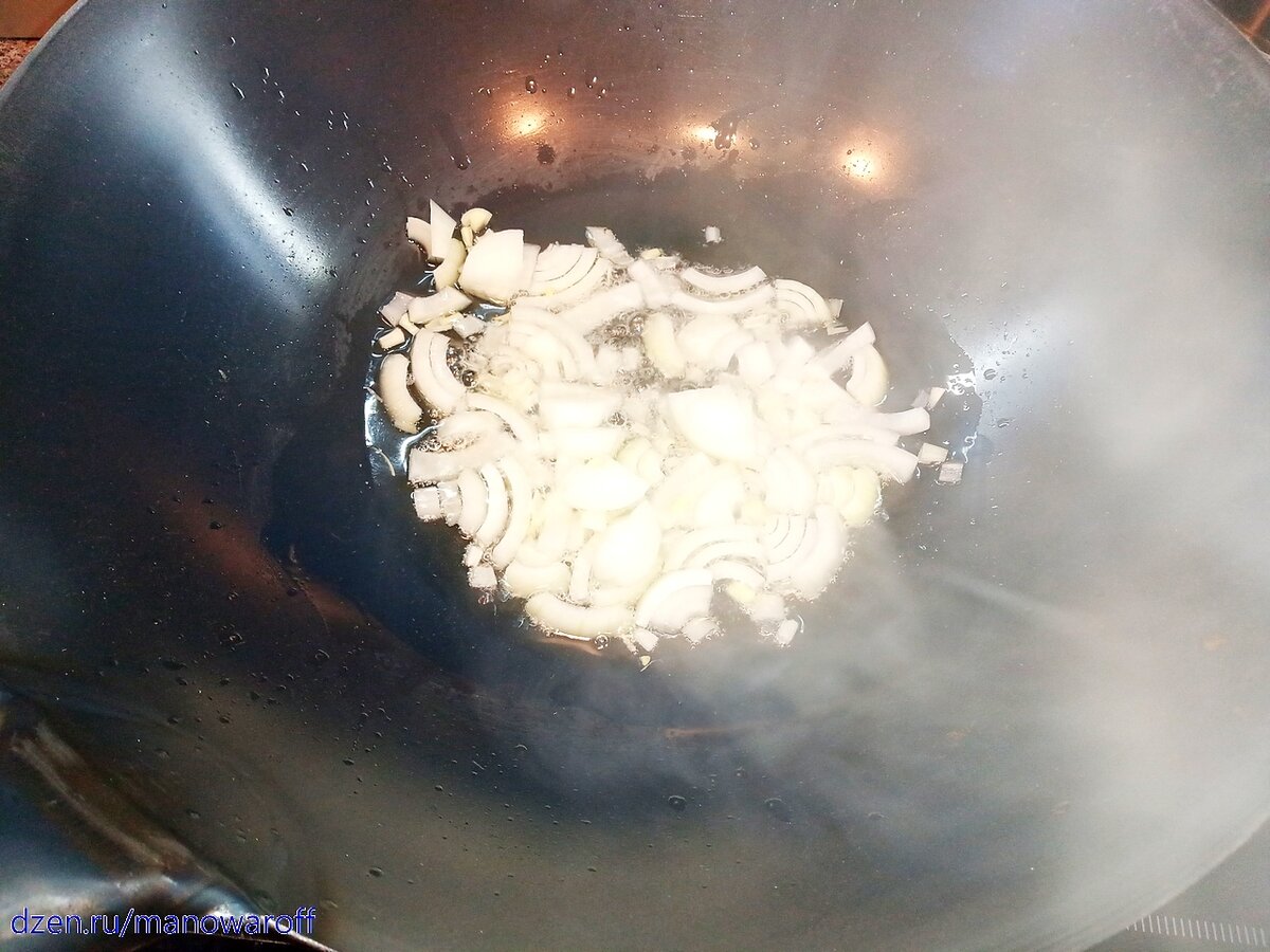 В воке на максимальном огне разогреваем масло и обжариваем репчатый лук в течение минуты.