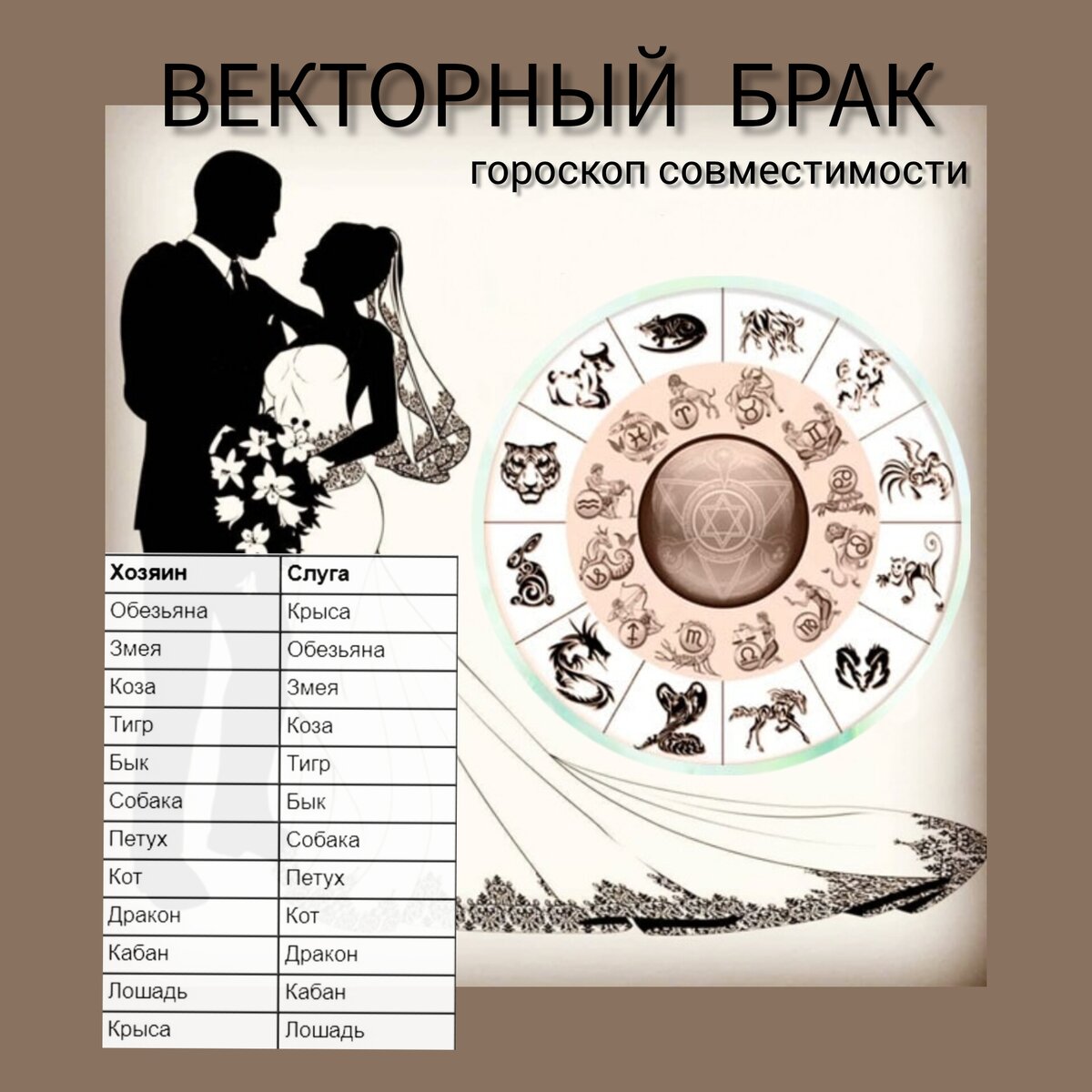 В брачном гороскопе по годам рождения выделяются 5 типов браков. Кроме векторного, существуют еще: • Духовный брак • Романтический брак • Патриархальный брак • Равный брак Сегодня мы подробно остановимся на векторном браке. Для начала по таблице определяем свой/партнера год рождения по восточному гороскопу. *Если вы родились в начале года (январь-февраль), то обязательно уточняйте свой знак по восточному календарю. Он может отличаться от приведенного в таблице. Если сами не сможете, то напишите мне в личку или в комментарии, я отвечу вам. В методе структурного гороскопа существуют такие понятия, как «векторное кольцо» или «векторный брак». Пары, которые образуют люди определенных годов рождения между собой, несут определенную смысловую нагрузку. Эти пары называются «векторными парами» и образуют векторное кольцо, в котором один из пары играет роль «слуги», а второй «хозяина». В этих парах, как правило, отношения возникают и развиваются помимо воли самих хозяев – не
