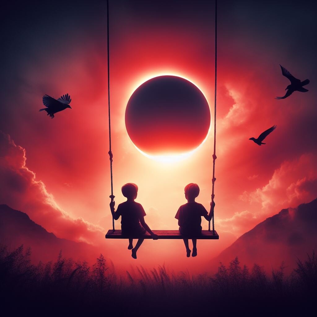 Близилось затмение, и тучи действительно быстро рассеялись, а небо становилось ярко алым, луна закрывала солнце, все больше и больше. Элиот и Уильям сидели на качелях и действительно смотрели с восхищением на затмение. Отец сидел на лавочке не подоплёку и не спускал глаз со своих сыновей, в лице менялся, словно старательно продумывал какой-то план. Элиот то и дело смотрел на затмение то на отца, и с каждым моментом, как луна закрывала солнце, лицо становилось более напряженным, словно в него вселялся злой дух.