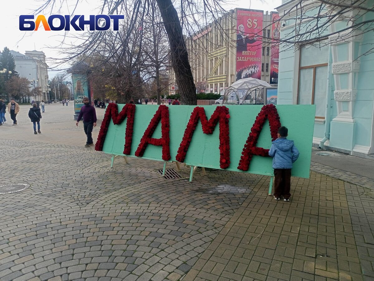 В День матери, 26 ноября, в центре Краснодара на Пушкинской площади из 1000 алых роз выложили пятиметровое слово «Мама». Показываем фото и видео. Инициатором поздравительной акции выступил флорист-дизайнер Иван Базин вместе с «Отцами России Краснодарского края». Напротив художественного музея искусств Коваленко на улице Красной на зелёном стенде длиною пять метров выложили из бутонов красных цветов слово «Мама». Благоухающую надпись нюхают дети Цветы предоставили питомники Краснодарского края и Адыгеи. В праздник всех мам место стало популярной фотозоной. И дети, и взрослые, прогуливающиеся по улице Красной, спешили сделать памятное фото с благоухающей инсталляцией. Памятное фото По словам Ивана Базина, таким флешмобом он хотел напомнить всем, что мама – главный человек в жизни каждого. И сегодня отличный день, чтобы радовать своих мам, дарить им внимание, заботу… цветы. Редакция «Блокнота Краснодара» присоединяется к поздравлениям и желает всем мамам здоровья, благополучия, любви и за