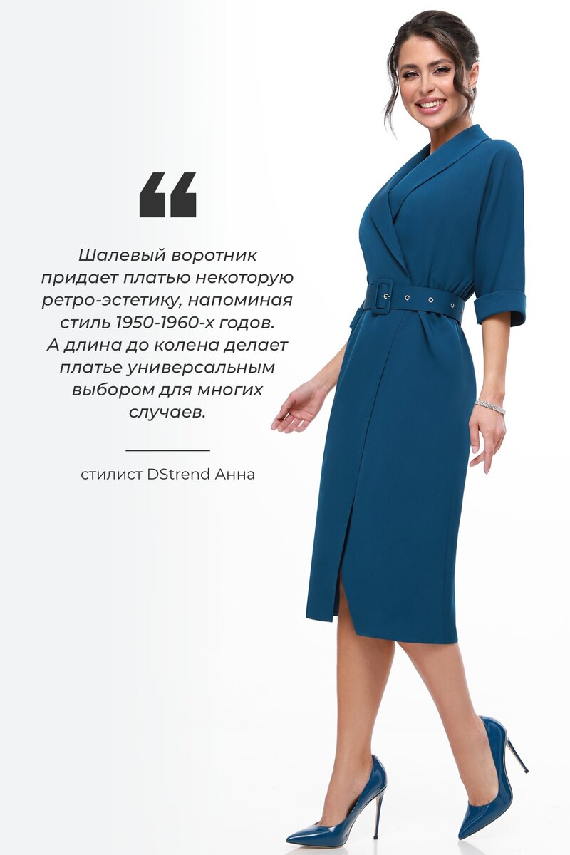 Шалевый воротник придает платью некоторую ретро-эстетику, напоминая стиль 50-60-х годов. Длина до колена делает платье универсальным выбором для многих случаев, подходит для офиса или вечернего выхода.