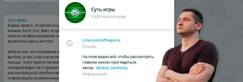 Это отрывок из поста, который в день 25-летия написал Никита Каширский, автор телеграм-канала «Суть игры». Там он полтора года публиковал заметки о футболе, разбирая, например, успех Пиоли в «Милане» и рассуждая о самореализации Акинфеева. До 7 ноября Никита ни разу не рассказывал, с какими препятствиями сталкивается, чтобы сделать даже самый короткий пост об игре. Просто писал о том, что любит – так привлек почти пять с половиной тысяч подписчиков и собрал несколько репостов от Василия Уткина.