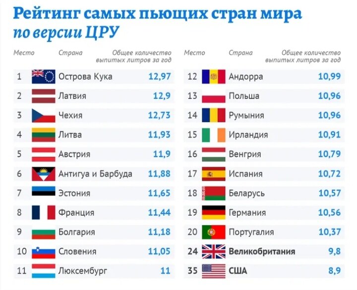 Согласно данным Всемирной организации здравоохранения (ВОЗ) и другим источникам, самыми пьющими странами мира являются Молдавия, Литва, Чехия, Нигерия, Германия, Ирландия, Люксембург, Латвия, Болгария, Румыния, Словения, Франция, Португалия, Бельгия, Сейшельские Острова, Россия, Австрия, Польша, Эстония и Великобритания . В рейтинге уровня потребления алкоголя учитываются данные о продажах алкогольных напитков, опросы населения, статистика смертности от пьянства и другие факторы. . Например, острова Кука, Латвия и Литва занимают лидирующие позиции в списке стран по потреблению алкоголя. . Страны, в которых потребляют меньше всего алкоголя, в основном находятся в Африке, Ближнем Востоке и Азии, где алкоголь строго запрещен по религиозным причинам. .