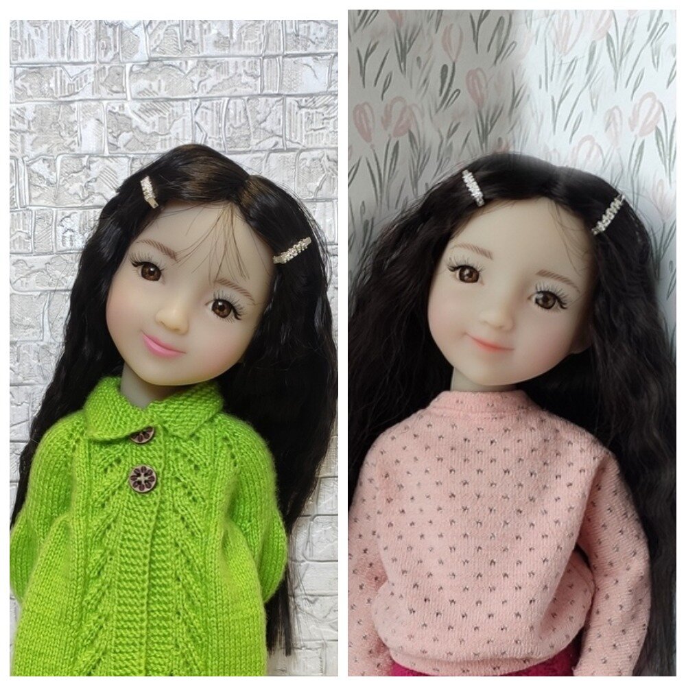 приветствую всех, не так давно писала, что получила свою первую и единственную Рубиночку и очень меня смущали губы ( если не брать в расчет необычный цвет винила) и сегодня я, наконец, решилась перерисовать губки Получился очень милый ребенок, мне она даже нравиться стала А еще на скорую руку сшила кофту, так, на глаз, а то зеленый ей вообще не идет, позже, конечно, сделаю нормальные выкройки и сошью что-то приличное На этом пока все