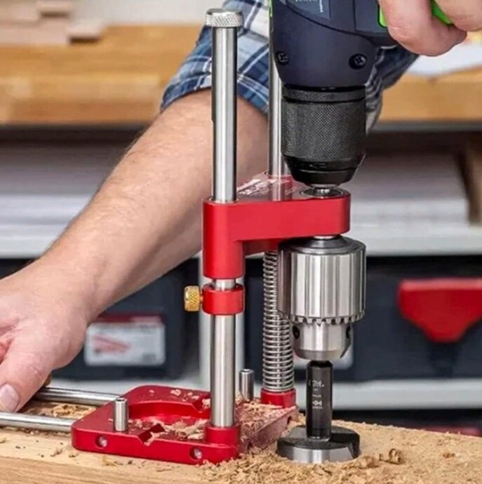 Это приспособление в разы улучшает точность сверления. Особенно эта вещь полезна для разных столяров. Да и вообще такая штуковина должна быть в арсенале каждого серьёзного мастера.