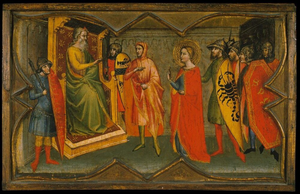 Помните я рассказывала про воображаемую геральдику Средневековья? Отличный пример, картина Джованни ди Бартоломео Кристиани, Мученичество св. Луции (Ок. 1370–1390-х гг).
