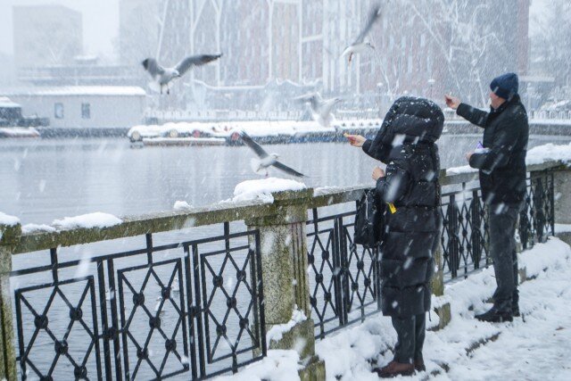 В последние ноябрьские выходные Калининград засыпало снегом. Он быстро преобразил улицы, укутал растения в белые шубки, нарядил дома и увлёк сотни горожан на прогулку. Вместе с детьми местные жители отправились в парки лепить снеговиков и кататься с горок.