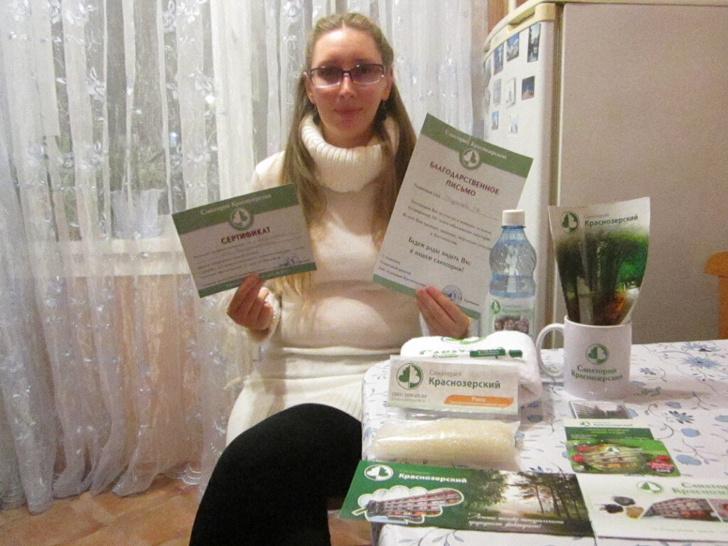 Как я писала ранее в сентябре 2014 года, будучи на лечении в санатории "Краснозёрский", я увидела объявление о конкурсе. Суть конкурса заключалась в том, что надо было рассказать как я провела отдых в санатории, помогло ли лечение. Это можно было сделать как в прозе, так и в стихах. Мы с сестрой с детства любим сочинять всякие песенки и стишки и я прям загорелась идеей принять участие в конкурсе. После возвращения домой, я сразу же села писать стих. Мысли, эмоции, всё переполняло. Я отразила это на бумаге и отправила сестре на коррекцию. Она у меня в совершенстве владеет русским языком)). Я в отличие от нее я могу забыть поставить запятую или ещё что-нибудь напортачить. После правки это стал просто шедевр! Добавили ему красивую "обёртку" и отправили на конкурс. Я сразу была уверена - победа будет за нами! Совсем забыла рассказать про приз. Победителю полагался комплект сувенирной продукции с логотипом (кружка, ручка, полотенце, рапа в пакете), а главное сертиф