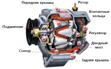 Генератор состоит из 8 частей, а потому поломка или появление определенных неисправностей не является редкостью. Основными элементами являются статор и ротором с коллектором и крыльчаткой охлаждения, которые и вырабатывают переменный ток, который в последующем выпрямляется с помощью диодного моста.