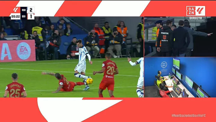 На 88-й минуте матча 14-го тура Ла Лиги арбитр Мигель Анхель Ортис Арьяс показал Серхио Рамосу вторую желтую карточку за опасный подкат против Браиса Мендеса – спустя 6 минут после того, как защитник «Севильи» получил первое предупреждение за фол против Такефусы Кубо. После просмотра ВАР вторая желтая карточка Рамосу была заменена на прямую красную. Изображение: кадр из трансляции DAZN На 89-й минуте с поля был удален Хесус Навас, получивший прямую красную карточку за споры с судьей. Матч завершился поражением «Севильи» со счетом 1:2. Игра про деньги в футболе: норм ли отдать 100 млн за Холанда? А за Беллингема?