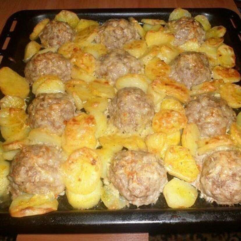 Очень часто готовлю данное блюдо,дети в восторге!!! Итак ингредиенты,которые нам понадобятся для данного блюда: фарш можно купить готовый,либо прокрутить самим. В мясной фарш добавляем лук, чеснок, яйцо, соль, перец, отварной рис и все перемешиваем.Формируем шарики из уже готового фарша. выкладываем на противень, свободные места заполняем картошкой. Солим картофель по вкусу, сверху посыпаем тёртым сыром и ставим в духовку (190 градусов) на 30-40 минут. Зовем семью и наслаждаемся вкуснейшим ужином😋