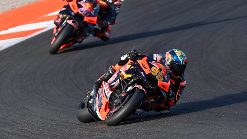 Брэд Биндер завершил сезон Moto GP 2023 года третьим местом в Валенсии, но заводской гонщик «Red Bull KTM» фактически не поднялся на подиум, так как штраф для Фабио Ди Джанантонио был назначен после гонки. Заняв второе место в спринте в субботу, Биндер сменил чемпиона мира Франческо Багнайю на вершине последней основной гонки года на шестом круге и лидировал до середины дистанции. В 11-м повороте южноафриканцу пришлось выехать широко после ошибки, что выбило его из борьбы за место на подиуме. «Когда мы были впереди, передняя шина остыла. Затем я услышал сильный грохот справа», — сказал Биндер. «Прежде чем я даже затормозил, в 11-м повороте передняя часть просто рухнула. Мне очень, очень повезло, что я вообще остался на мотоцикле. Но мне пришлось проехать по длинному виражу, и я потерял много времени, потому что там было очень скользко. Тем не менее, до этого момента дела у нас шли хорошо. Мне также очень повезло, что я не попал в гравий, так что все это бонус». Было ли позднее время ст