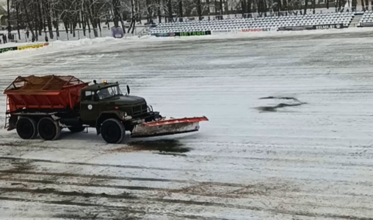 В Сморгони спецтехника перед матчем посыпала футбольное поле песком и солью