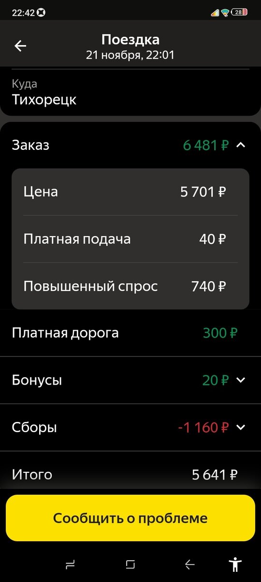 Думал, меня отключат от заказов, поскольку я находился на линии более 12 часов, но нет, ничего подобного. Я довольный, включил режим «домой» и поехал в надежде на какой-нибудь заказ. И мне повезло. Из одной станицы Октябрьская, я забрал девушку и отвез в станицу Кущёвскую, 43 км проехал не впустую и по пути. Ребята вызвали девушку себе, я им её доставил, мы еще все вместе съездили в магазин за алкоголем. Заказ был 1600, но получил я 2 т.р. Уже стало не так обидно, что утром дела, что я отказался от 3 т.р., которые предлагал авантюрист. Надеялся еще получить заказ, но больше ничего не прилетело. Уже в Ростове мне дали заказ, чтоб я не ехал по городу пустым. Но когда я подъехал к адресу, отбился, что на месте, увидел точку Б, которая была совсем в другую сторону от моего дома, поскольку уже устал, отменил заказ, снялся с линии и поехал домой.