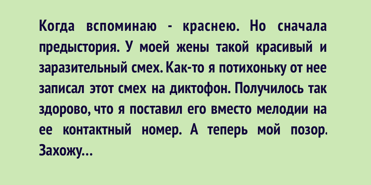 Когда вспоминаю - краснею. Но сначала предыстория. У моей жены такой красивый и заразительный смех. Как-то я потихоньку от нее записал этот смех на диктофон. Получилось так здорово, что я поставил его вместо мелодии на ее контактный номер. А теперь мой позор. Захожу… на работе в туалет (а там вечно народ собирается покурить), перед писсуаром расстегиваю ширинку, достаю… И в этот момент звонит моя жена. Не ржали только писсуары…