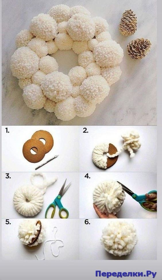 Посмотрите какая классная идея с помпонами! Можно взять любые цвета пряжи из ваших остатков и сделать много разных помпонов, затем на любую основу привязать их и получится красивый рождественский венок.