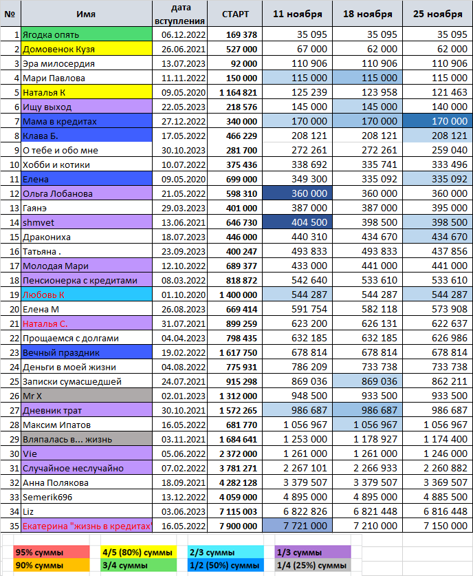 Привет всем! Вот и готовы результаты очередной недели. Неделя в этот раз спокойная, событий мало, и изменений цвета ни у кого не было. Что ж, и такие недели тоже должны быть. Не каждый раз же рекорды ставить. Итак - сводная таблица: Кто же в этот раз погасил самые большие суммы: В этот раз на первом месте наш "тяжеловес" Екатерина "жизнь в кредитах", погасившая 60000. Хоть эта сумма не самая большая для неё, но она самая большая среди всех участников за эту неделю. А на втором месте - Татьяна с результатом минус 55977. Замыкает тройку лидеров Vie, погасившая 15000р. Поздравляем! А вот кто занимает первые места по погашению в процентах к долгу: На первом месте - Татьяна, погасившая 11,34% от долга. На втором - О тебе и обо мне, её долг уменьшился на 4,86%. А на третьем опять же Ищу выход, её погашение составило 3,45% от долга. поздравляем! Результаты всех участников а также погашение за весь срок марафона смотрите в карусели таблиц: Вот собственно и всё, что принесла марафонцам эта неде