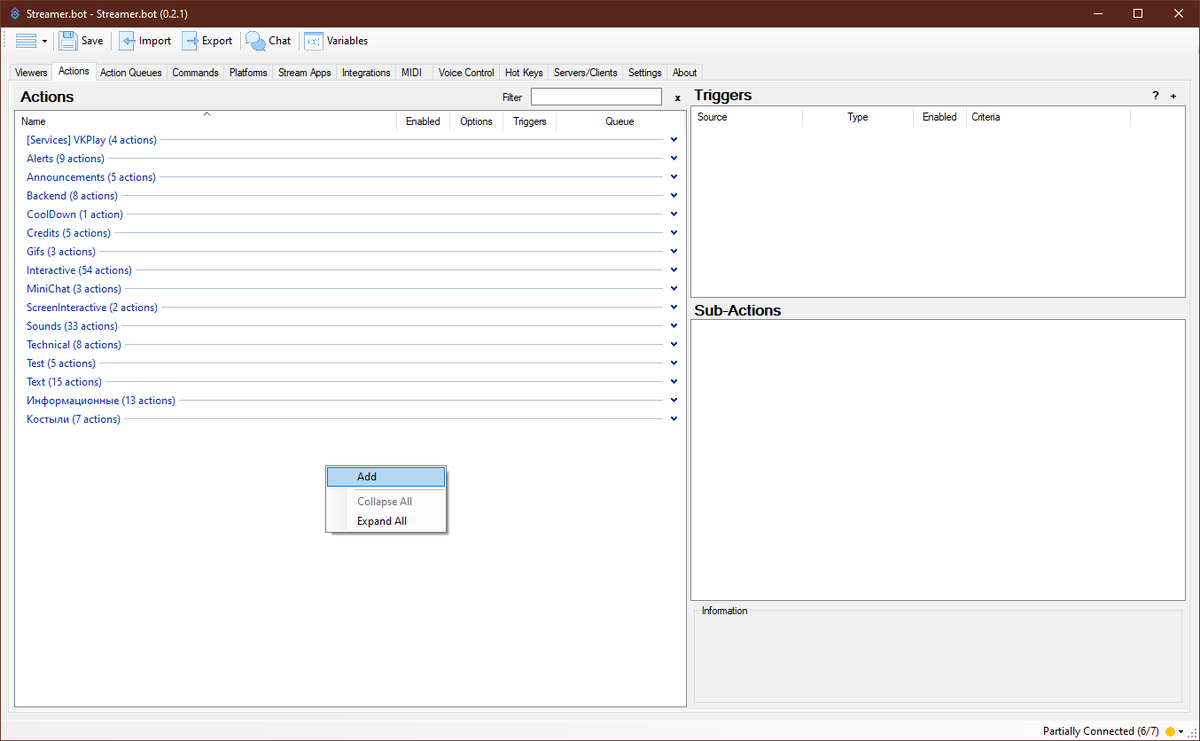 Открываем стримербот и создаём новое действие (в дальнейшем, я буду называть действия экшенами).