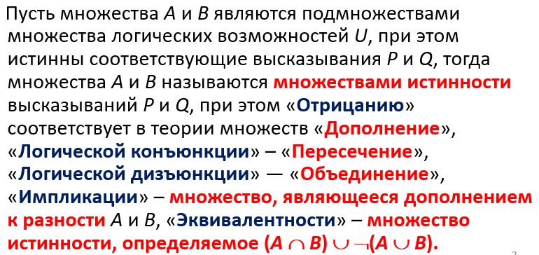 Рассмотрим ещё один пример взаимосвязи теории множеств с логикой высказываний.