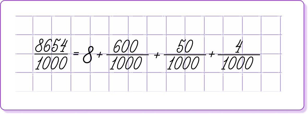 Чтобы точно понять десятичные дроби, нужно разобрать одну тему про обыкновенные дроби. Часто ее не разбирают в школе. Тему я назову «Как разложить дробь со знаменателем 100 или 1000 в сумму дробей». Это неофициальное название. Начнем. Запиши дробь восемь тысяч шестьсот пятьдесят четыре тысячных. Выдели целую часть. Будет восемь целых шестьсот пятьдесят четыре тысячных. Разложи эту дробь на сумму дробей со знаменателем 10, 100 и 1000. То есть найди такие числа вместо звездочек на картинке справа, чтобы равенство стало верным. Для этого ответь на вопросы: «Сколько десятых долей содержится в числе?», «Сколько сотых долей содержится в числе?» Представь числитель как сумму сотен, десятков и единиц. А теперь разбей дробь на сумму дробей. Это действие кажется немного непривычным. Но попробуй прочитать равенство в другую сторону — так и складываются дроби. Сократи дроби на 100 и на 10. Готово! Закрепи это правило на следующем примере. Попробуй сначала найти разложение. Затем открой ответ. Тебе