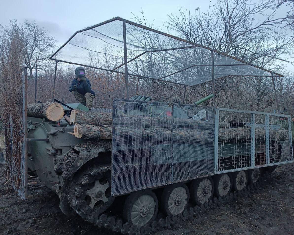Барражирующие боеприпасы и их близкие родственники, такие как FPV-дроны, стали тем самым недорогим, но грозным противником отечественной бронетехники – от автомобилей и БМП, до тяжелобронированных танков, в прочем это правило работает и против сил украинской армии. И для снижения подобных угроз со стороны украинских формирований, российские образцы бронетехники стали улучшаться по качеству защиты руками самих военнослужащих в полевых условиях. Примером такого импровизированного апгрейда можно назвать установку решеток на корпус боевых машин. Источник фото: ТГ-канал "Как я поехал на войну. Платон Маматов" Но один из экипажей БМП пошел ещё дальше, «интегрировав» в качестве одновременно и защитного, и в качестве маскировочного средства – обыкновенные брёвна и хворост. Усовершенствование подобным образом даёт дополнительные гарантии, что попавший в своеобразный хэндмэйд кумулятивный боеприпас активируется раньше времени, тем самым дав высокий шанс избежать повреждений собственной броне тех